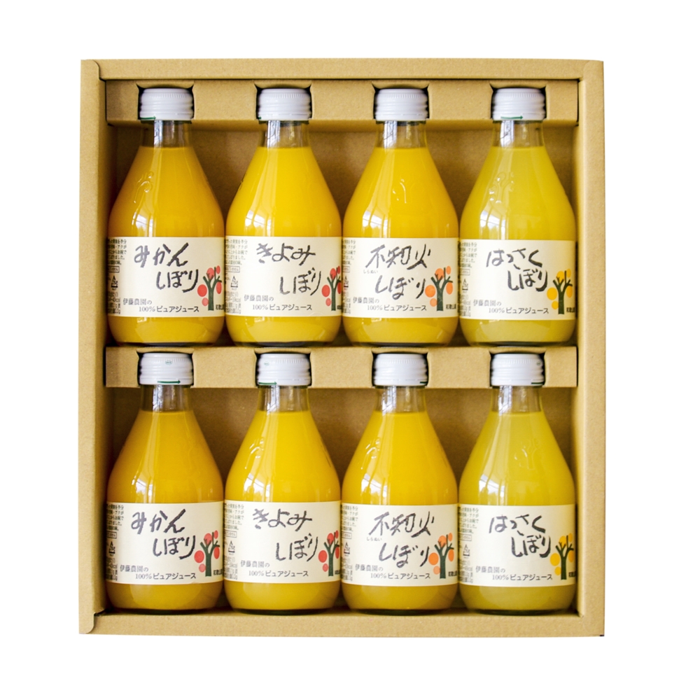 内容:180ml×8本(みかんしぼり×2本、きよみしぼり×2本、はっさくしぼり×2本、不知火しぼり×2本)