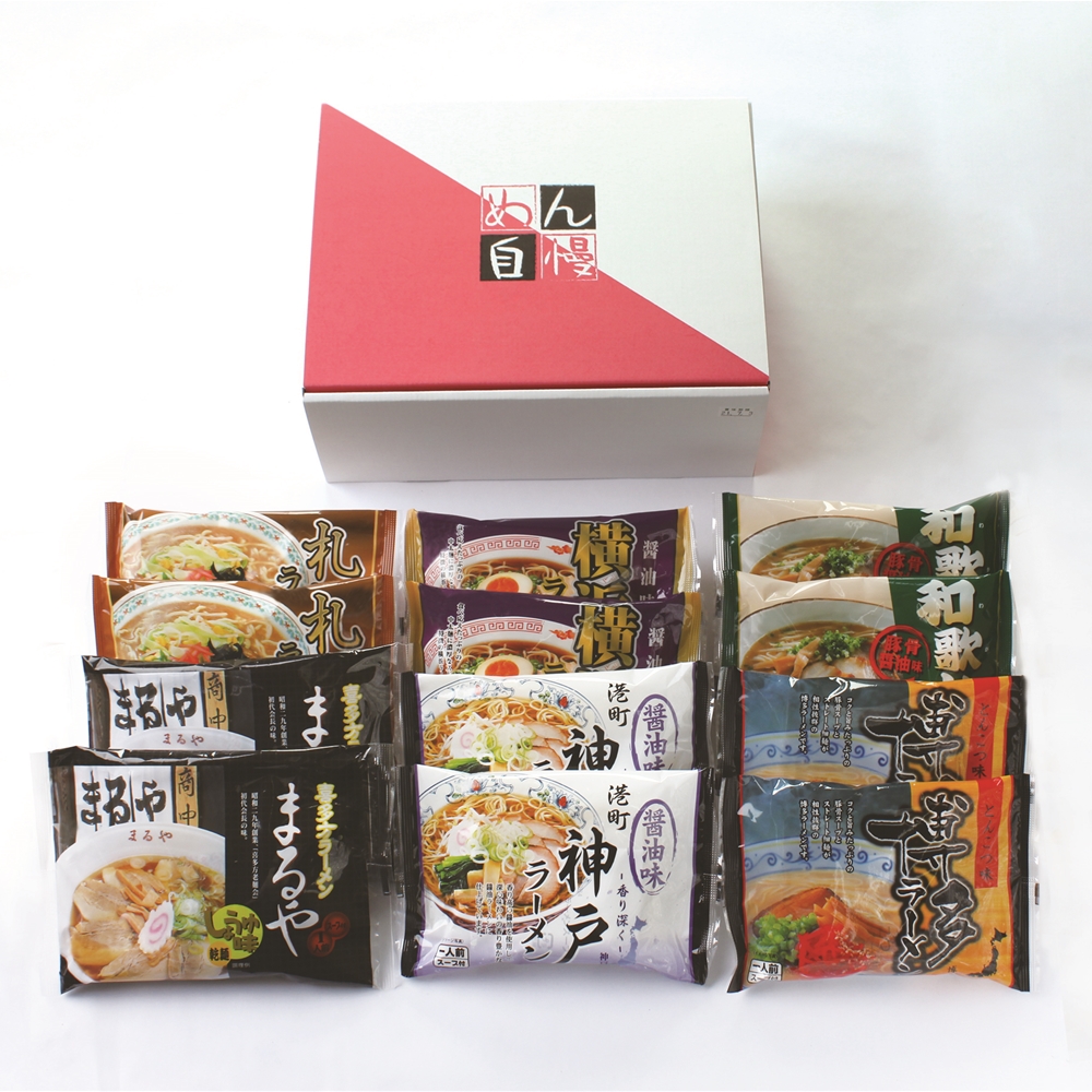 内容:札幌ラーメン(味噌)、喜多方ラーメン(醤油)、横浜ラーメン(醤油)、和歌山ラーメン(豚肉骨醤油)、神戸ラーメン(醤油)、博多ラーメン(豚肉骨)各80g×各2