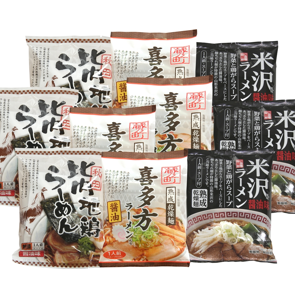 内容:喜多方ラーメン(麺70g、スープ36g)×4、秋田比内地鶏肉ラーメン(麺70g、スープ40g)×3、米沢ラーメン(麺70g、スープ31g)×3