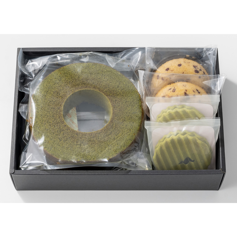 元禄年間創業の老舗「丸久小山園」の宇治抹茶を使用した上品で芳醇な香りが広がるバウムクーヘン。優しい甘さの小豆の焼きドーナツに厚みのある波型クッキーに、口どけの良いクリームをサンドしたヴァッフェルもご一緒に。