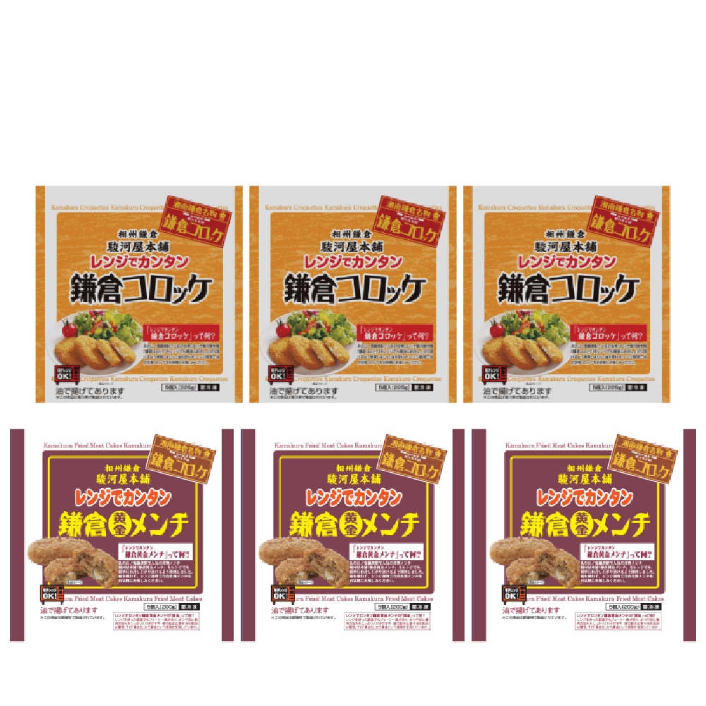 内容:レンジでカンタン鎌倉コロッケ225g(45g×5)×3、レンジでカンタン鎌倉黄金メンチ200g(40g×5)×3