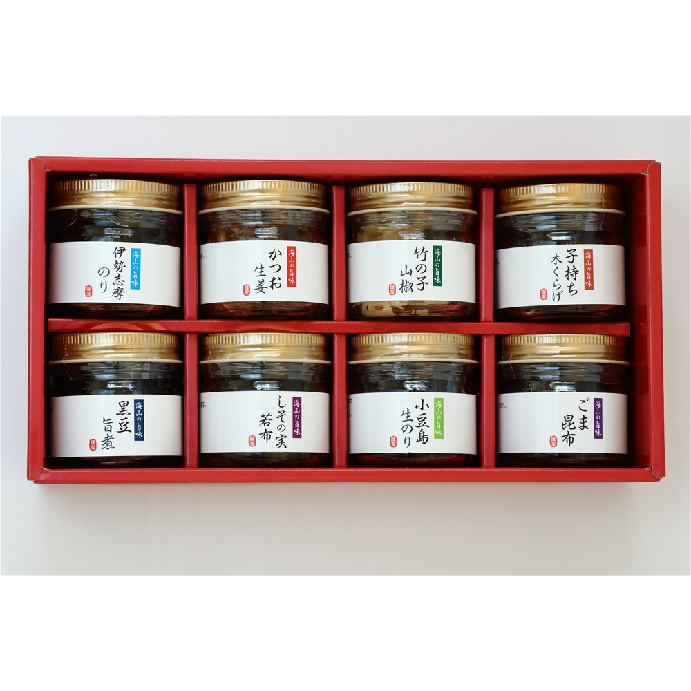 内容:伊勢志摩のり60g、小豆島生のり60g、かつお生姜35g、しその実若布40g、黒豆旨煮80g、ごま昆布40g、子持ち木くらげ30g、竹の子山椒45g