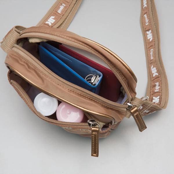 散歩や旅行のお供に ブランドロゴのテープが特徴のショルダーバッグです。軽い素材を使用しちょっとしたお出掛けや散歩等に大変便利です。旅行時の持ち運びに小さく収納することもできます。