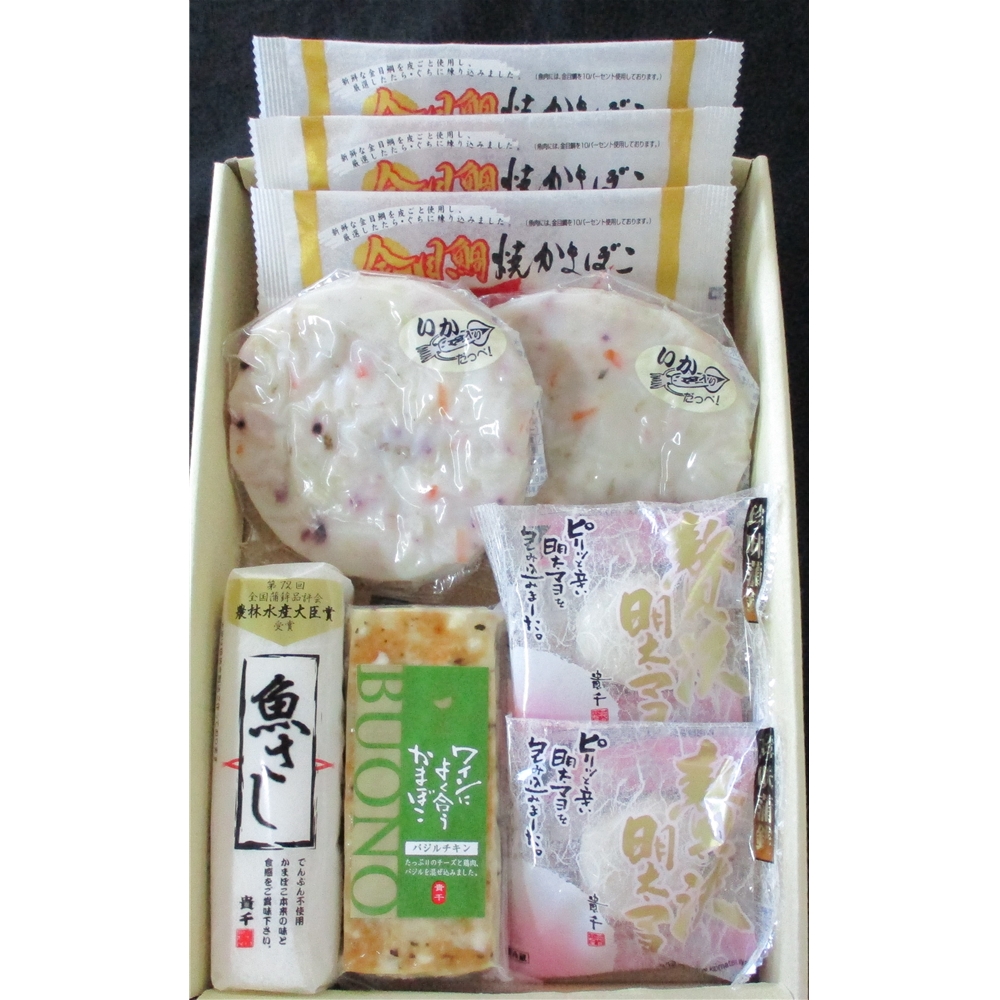 内容:魚さし100g×1本、ワインによく合うかまぼこバジルチキン×1枚、珍味蒲鉾贅沢明太マヨ×2個、白蒸しかまぼこいか×2枚、金目鯛焼かまぼこ×3枚