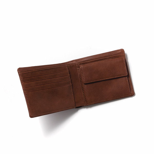 男性に人気の二つ折り財布です。素材に風合いがありとても機能的な折財布です。