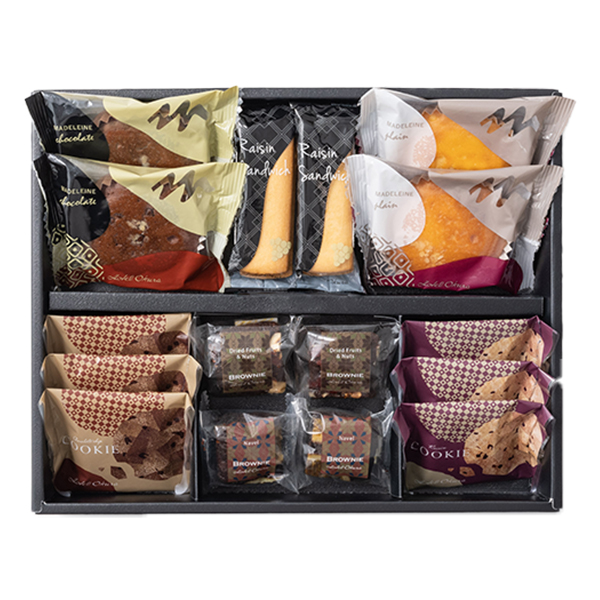 内容:レーズンクッキー・チョコチップクッキー×各3個、レーズンサンド・ブラウニー(ネーブル・ドライフルーツ&ナッツ)・マドレーヌ(プレーン・チョコ)×各2個