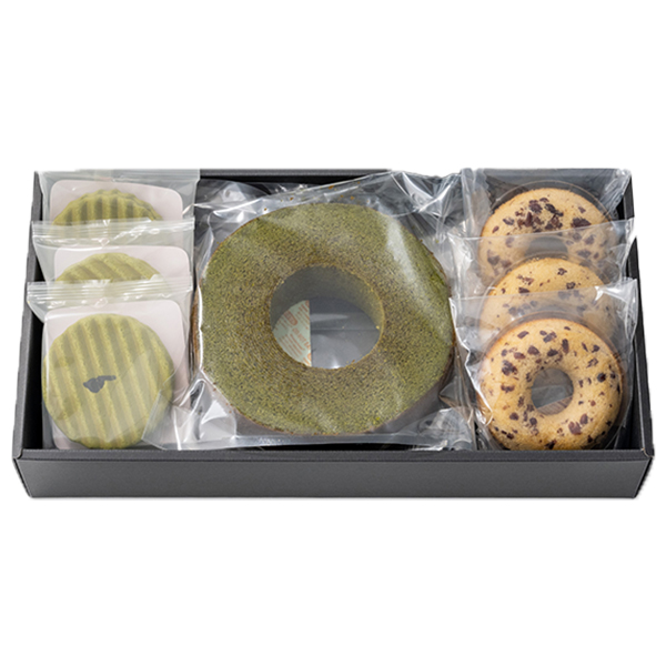 内容:宇治抹茶バウムクーヘン×1個、小豆ドーナツ×3個、ヴァッフェル×3個