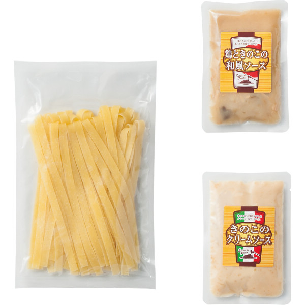 内容:生パスタ100g×4・きのこクリームソース、きのこと蒸し鶏の和風ソース各130g×各2