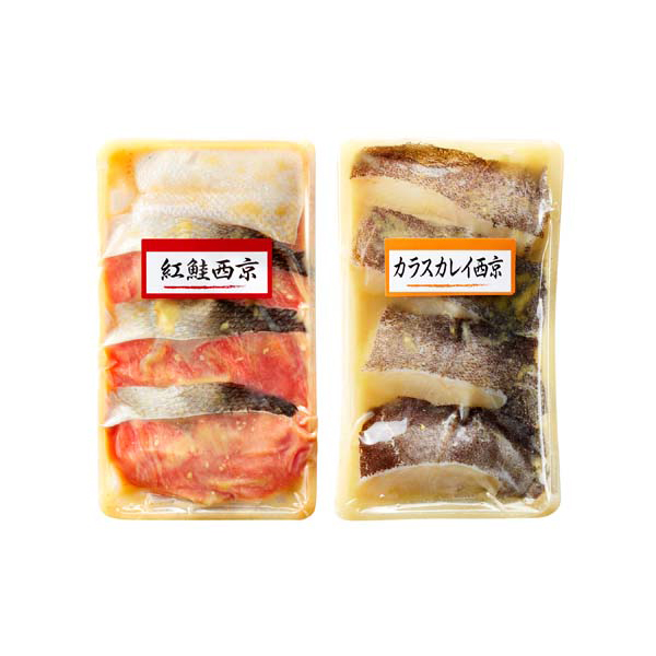 内容:カラスカレイ西京漬4切(計160g)、紅鮭西京漬4切(計160g)