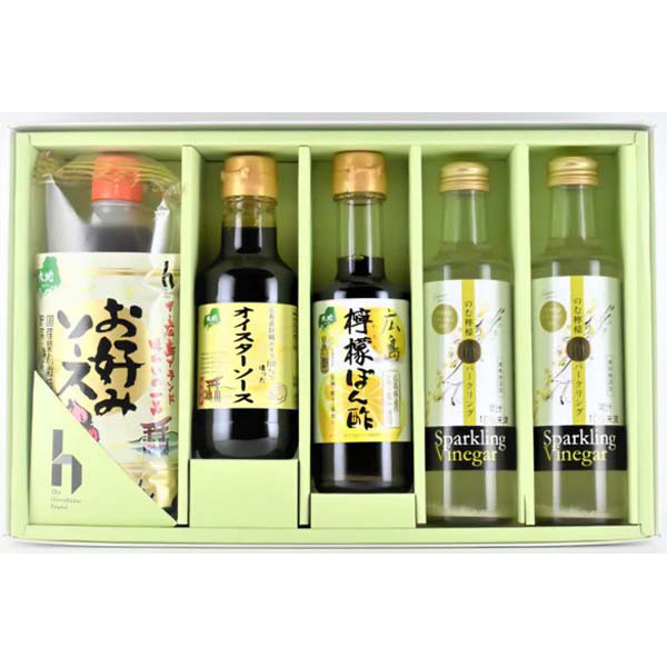 内容:広島ぢゃけんお好みソース500g、オイスターソース250g、広島檸檬ぽん酢180ml×各1、のむ檸檬酢パークリング200ml×2