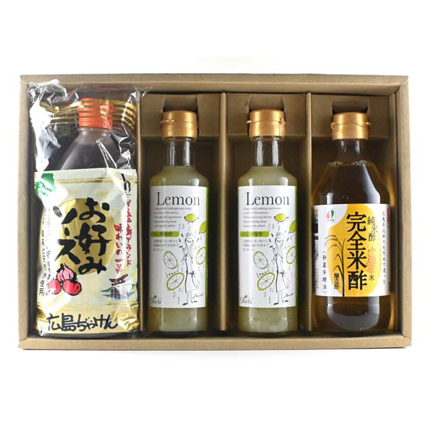 内容:広島ぢゃけんお好みソース500g、広島産完全米酢360ml×各1、のむ檸檬酢200ml×2