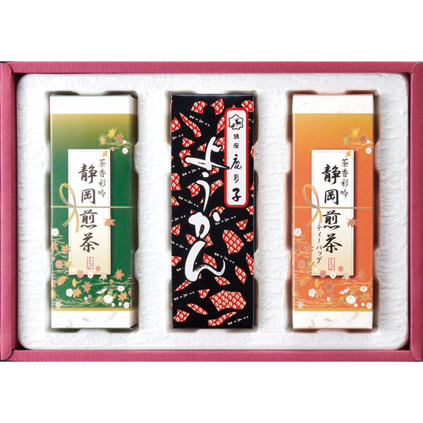 内容:銀座鹿乃子 ようかん200g×1、静岡煎茶ティーバッグ(3g×6袋)×1、静岡煎茶(緑)80g×1