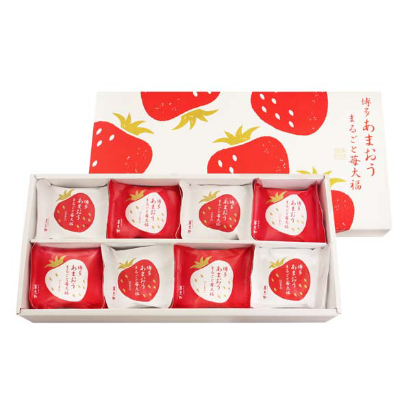 福岡の苺農家さんが愛情たっぷりに育てたMサイズの博多あまおうを、まるごと1玉使用した紅白2種類の苺大福。一口頬張ると、あまおうの酸味と、あんこの上品な甘みがお口の中に広がります。半解凍で美味しくお召し上がりいただけます。フルーツ大福で有名な京都養老軒監修。