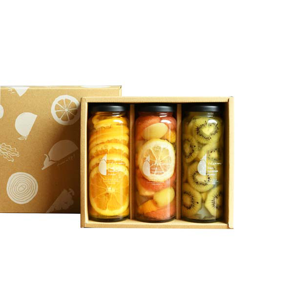 内容:6種のフルーツコンポート210g、キウイのフルーツコンポート220g、輪切りオレンジのコンポート220g×各1本