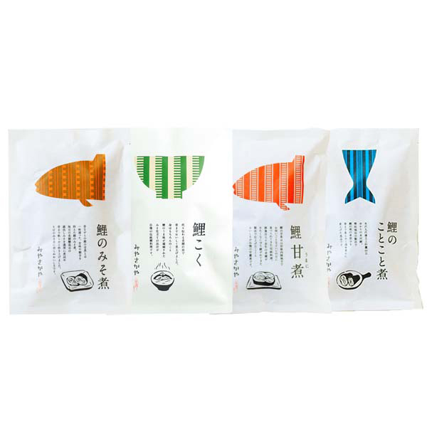 内容:鯉の甘煮170g、鯉こく220g、鯉の味噌煮160g、鯉のことこと煮150g
