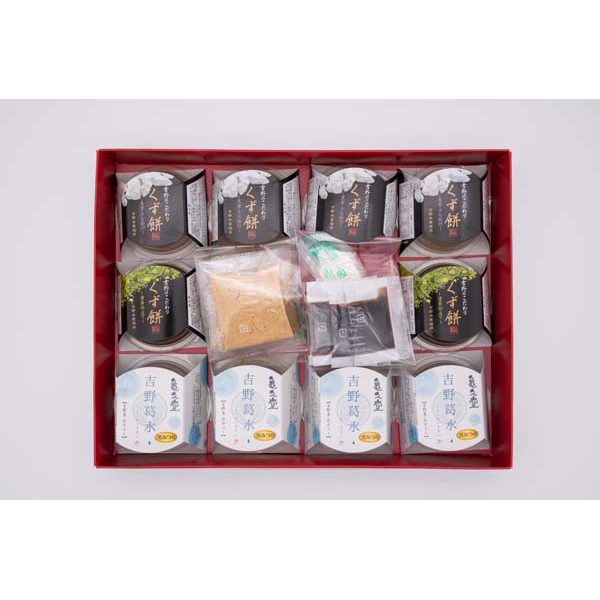内容:くず餅プレーン(黒蜜5g・きな粉5g付)75g×4、くず餅抹茶(黒蜜5g・きな粉5g)75g×2、吉野葛水(黒蜜5g)75g×4 計10