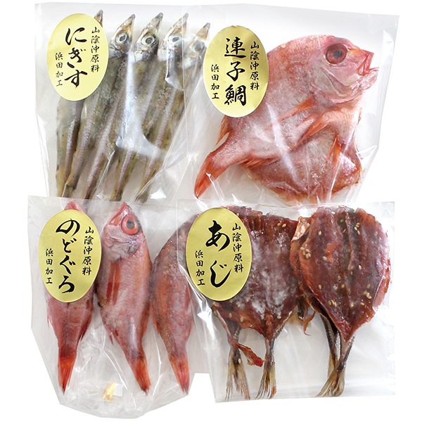 内容:にぎす丸干し80g(5尾)、あじみりん干し70g(4尾)、のどくろ丸干し100g(3尾)、連子鯛開き干し90g(1尾)