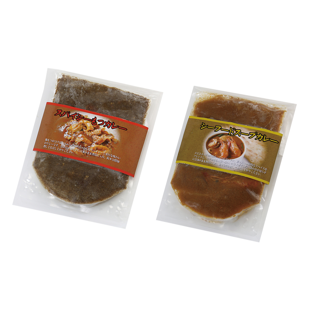 スパイーシーモツカレーには複数のスパイスのブレンドの中にたっぷりな豚モツ、 シーフードスープカレーには、エビとホタテをふんだんに使った、 どちらもコクの ある奥深い味わいに仕上がった絶品カレーです。袋の封を切らずに冷凍のまま熱 湯に入れ、約8分加熱してお召し上がりください。