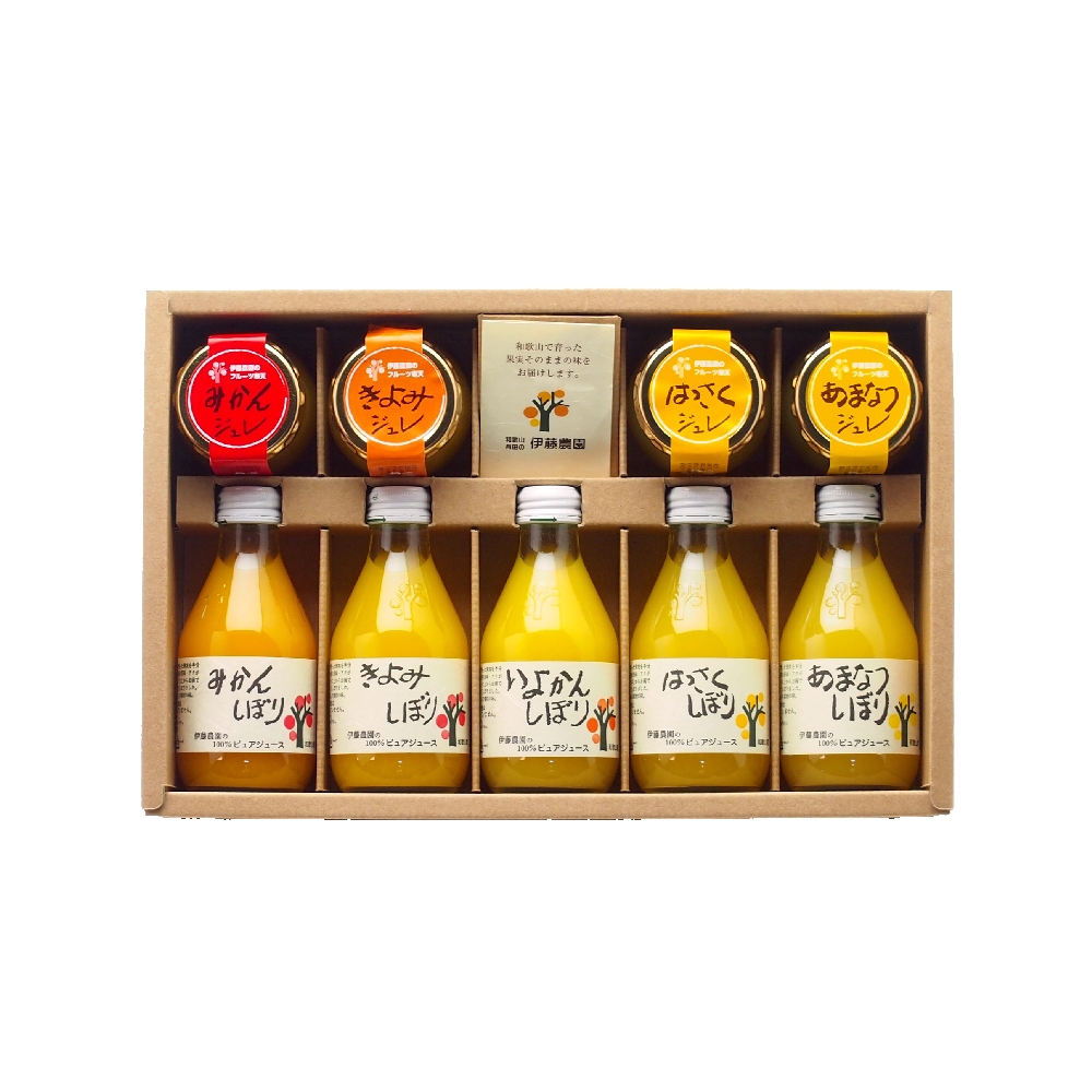 内容:100%ピュアジュース 180ml×5(みかんしぼり、きよみしぼり、いよかんしぼり、はっさくしぼり、あまなつしぼり 各1本) ピュアフルーツ寒天ジュレ(みかん、きよみ、はっさく、あまなつ 各1個)