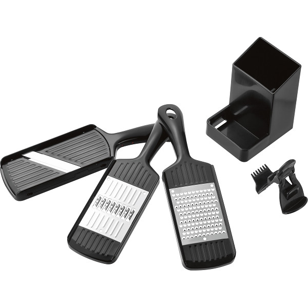 3種類の調理がこれ1つでできる。スタンド収納で場所をとらずサッと取り出せる。スライサー、千切り、薬味おろし、ホルダー付き。