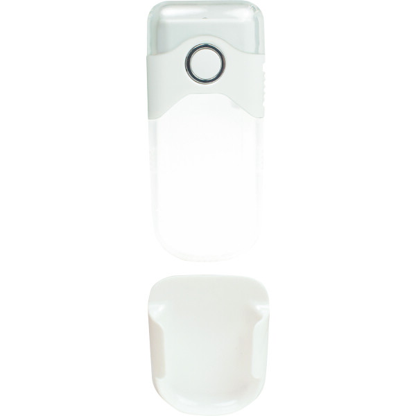 屋内用●ABS樹脂、LED=高輝度白色LED球×4灯●電源=AC100V、消費電力約0.6W、内蔵充電池=ニッケル水素電池●充電時間約15時間・連続使用時間=満充電時約1時間(懐中電灯)●充電寿命=充放電サイクル約500回