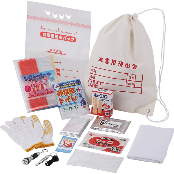 内容:非常袋・非常用給水バッグ(3l)・すべり止め手袋・防寒シート(約210×130cm)・ミニライト(モニター用ボタン電池LR-41×4個付)・ホイッスル・救急絆創膏2サイズ40枚(医療機器届出番号:43B2X10001000020)・カイロ・防災用ウエットティッシュ・非常用トイレ・マスク・レジャーシート(約160×90cm)・タオル・防災ガイド×各1