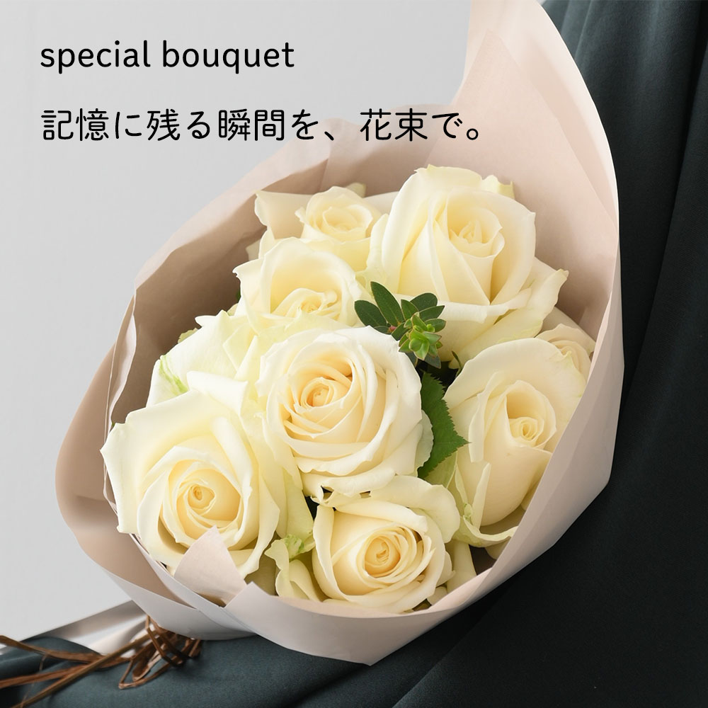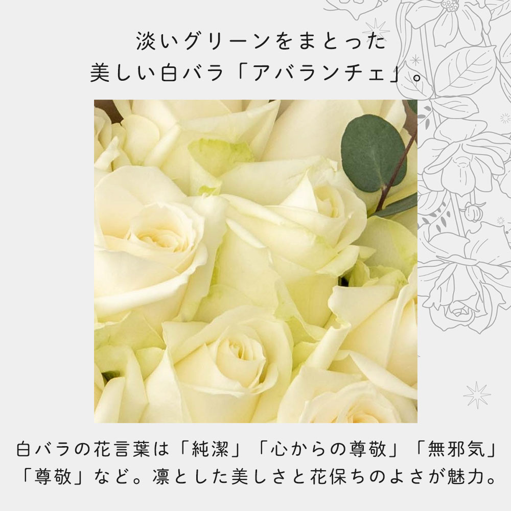 敬愛の気持ちをこめて贈るにふさわしい白バラ・アバランチェは、凛とした美しさと花保ちの良さで、もらった瞬間からはじまる花のある暮らしを演出します。男性へのギフトフラワーとしてもおすすめです。