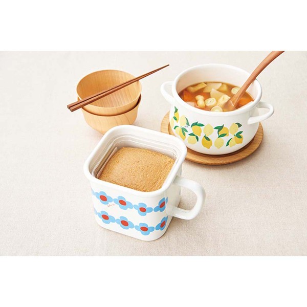 それぞれ表情の違った猫達がキュートなマルチスクエアポットです。ミミ・ココ・モモ3匹の実在した猫がモチーフになっています!保存容器としてだけでなく、保存したお料理をそのまま加熱して食卓に出すこともできる機能的なアイテム。スープストックや味噌ポットとしても!取っ手付きなので冷蔵庫から取り出しやすい!新潟県燕市でひとつひとつ絵柄を丁寧に手で貼り、仕上げているホーローです。ホーローは耐酸性に優れており、酸・塩分に強く、においや汚れもつきにくい性質があります。また色が移らず、雑菌が繁殖しにくいので衛生的です。かわいらしいデザインで、贈り物にも喜ばれます。