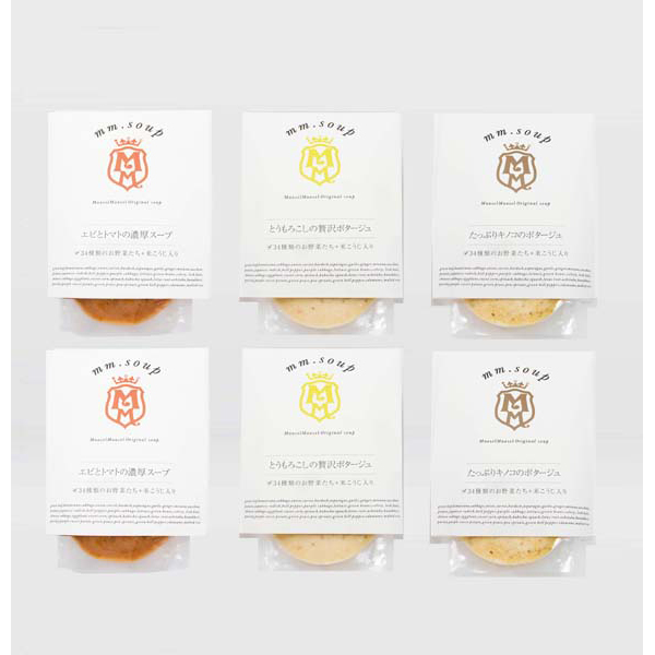 内容:とうもろこしの贅沢ポタージュ180g、エビとトマトの濃厚スープ180g、たっぷりキノコのポタージュ180g、アスパラガスと玉葱のポタージュ180g、とろーり濃厚かぼちゃのスープ180g、白ネギと生姜の煮込みスープ180g