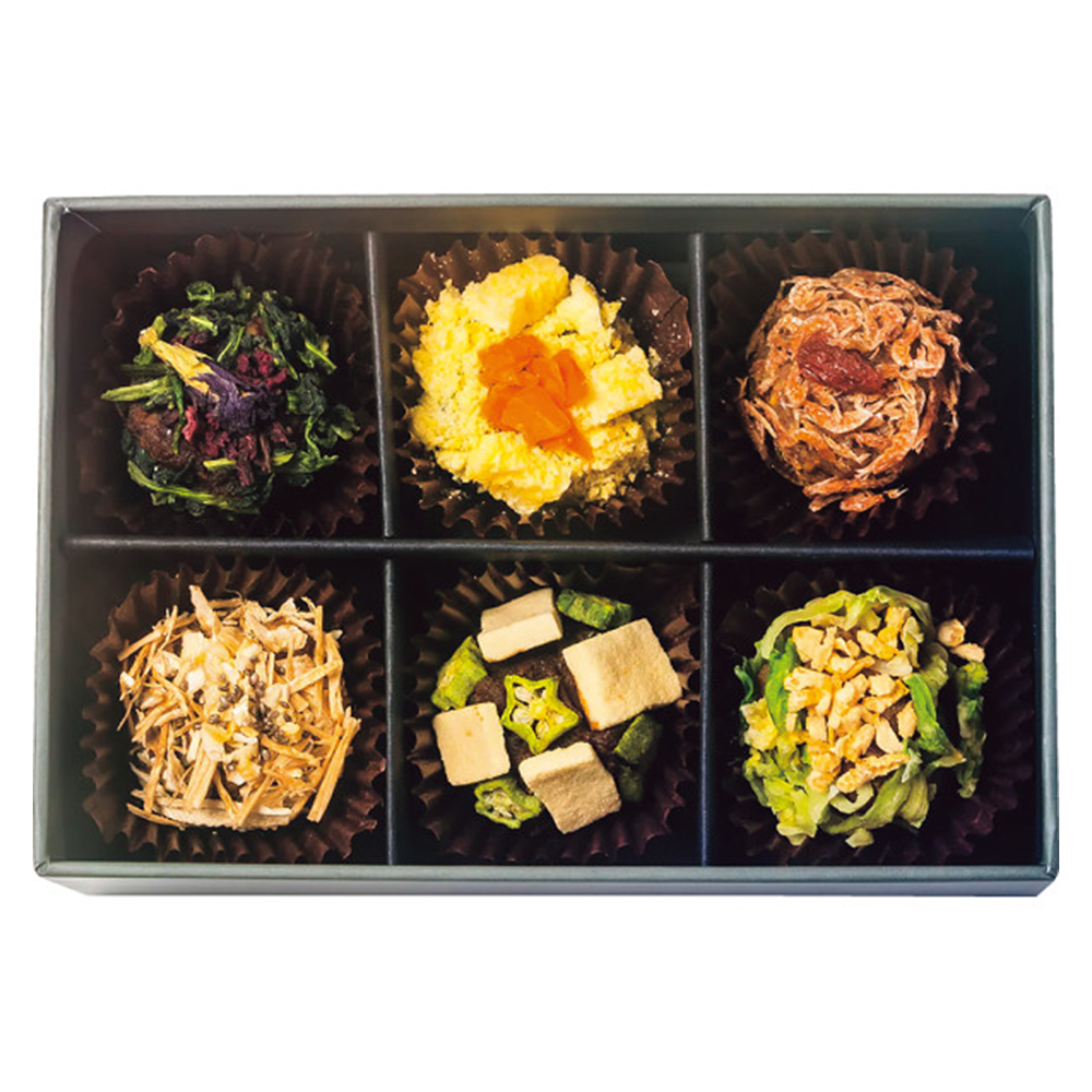 内容:みそ玉(青[カリウム]:加賀味噌、八丁味噌使用・赤[ビタミンA]:北海道味噌、ひよこ豆味噌使用・桃[カルシウム]:加賀味噌、九州麦味噌使用・茶[食物繊維]:仙台味噌、ひよこ豆味噌使用・白[タンパク質]:北海道味噌、八丁味噌使用・黄[ビタミンC]:加賀味噌、山吹味噌使用×各1)