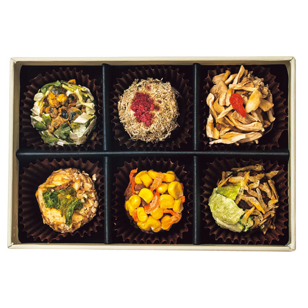 内容:みそ玉(紫[鉄]:玄米味噌、黒豆味噌使用・緑[葉酸]:加賀味噌、黒豆味噌使用・水[ビタミンB1]:北海道味噌、九州麦味噌使用・黒[マグネシウム]:山吹味噌、ひよこ豆味噌使用・橙[ビタミンD]:仙台味噌、玄米味噌使用・灰[亜鉛]:山吹味噌、八丁味噌使用×各1)