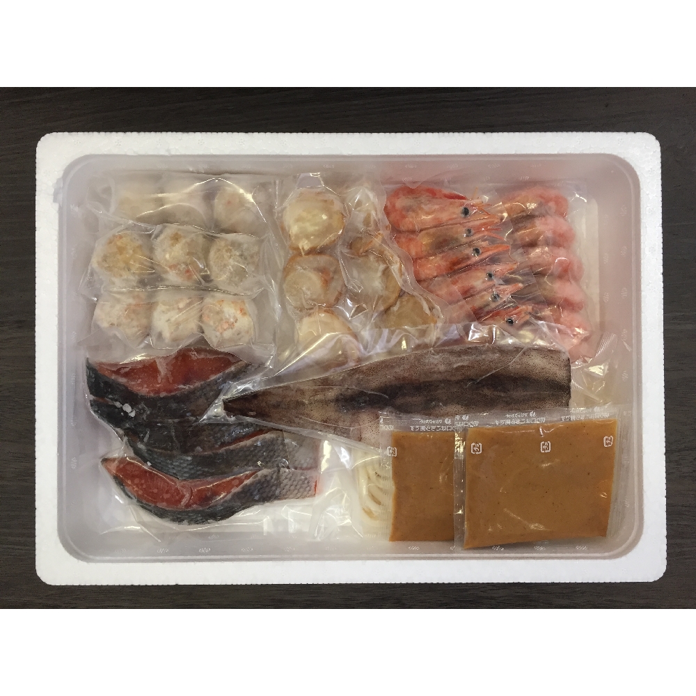内容:秋鮭切身40g×4切、ボイル海老×12尾、ボイル帆立×6個、かに入つみれ×3個、えび入つみれ×3個、とりごぼうつみれ×3個、ツボ抜きいか100g×1尾、冷凍うどん250g×1玉、たれ(濃縮:味噌仕立て)50g×2袋