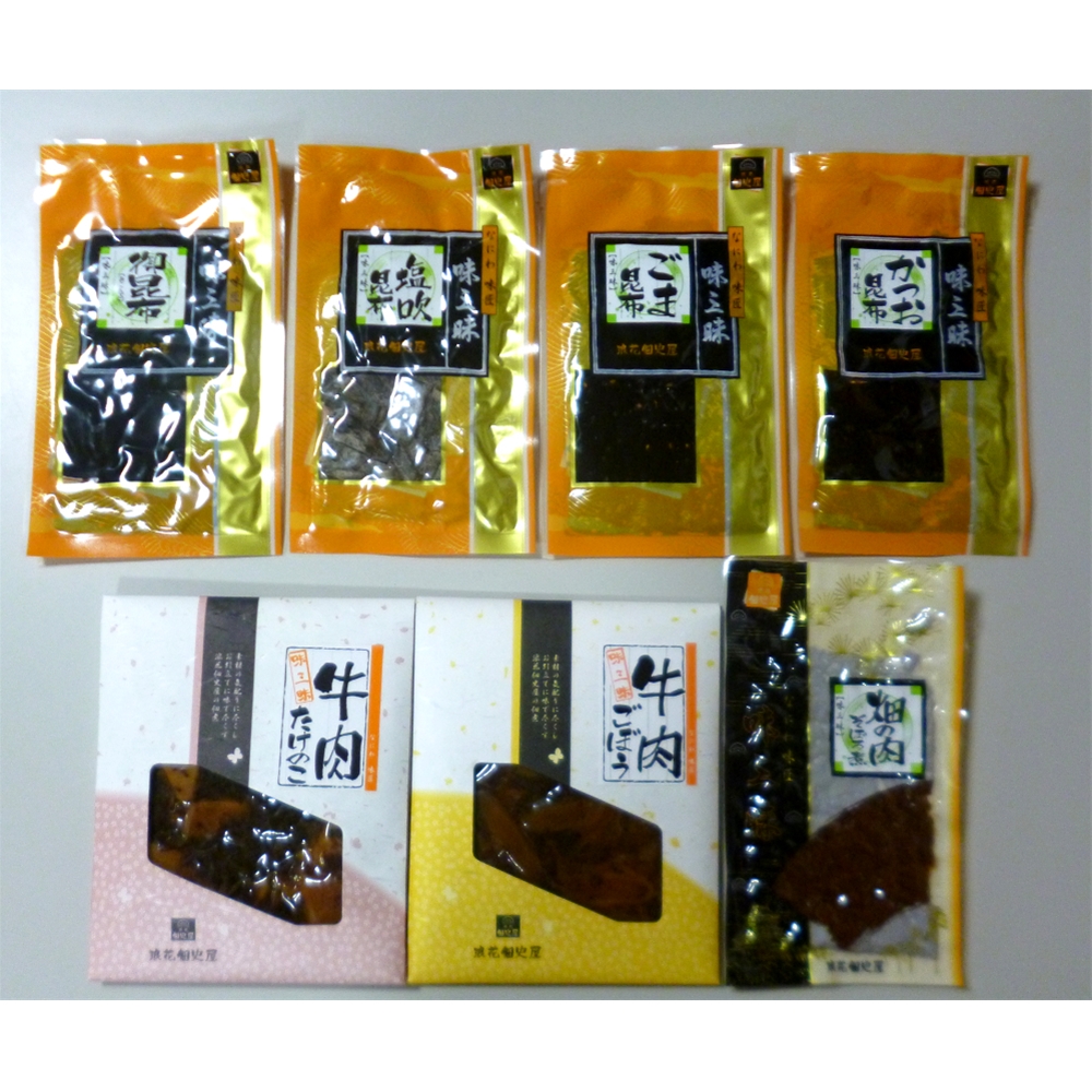 内容:牛肉ごぼう70g、ごま昆布60g、御昆布60g、畑の肉そぼろ煮60g、かつお昆布60g、塩吹昆布50g、牛肉たけのこ80g×各1