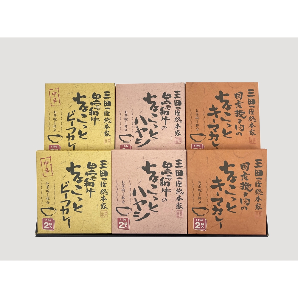 内容:黒毛和牛ちょこっとビーフカレー中辛(110g×2入)×2、黒毛和牛のちょこっとハヤシ(110g×2入)×2、国産挽き肉のちょこっとキーマカレー(110g×2入)×2