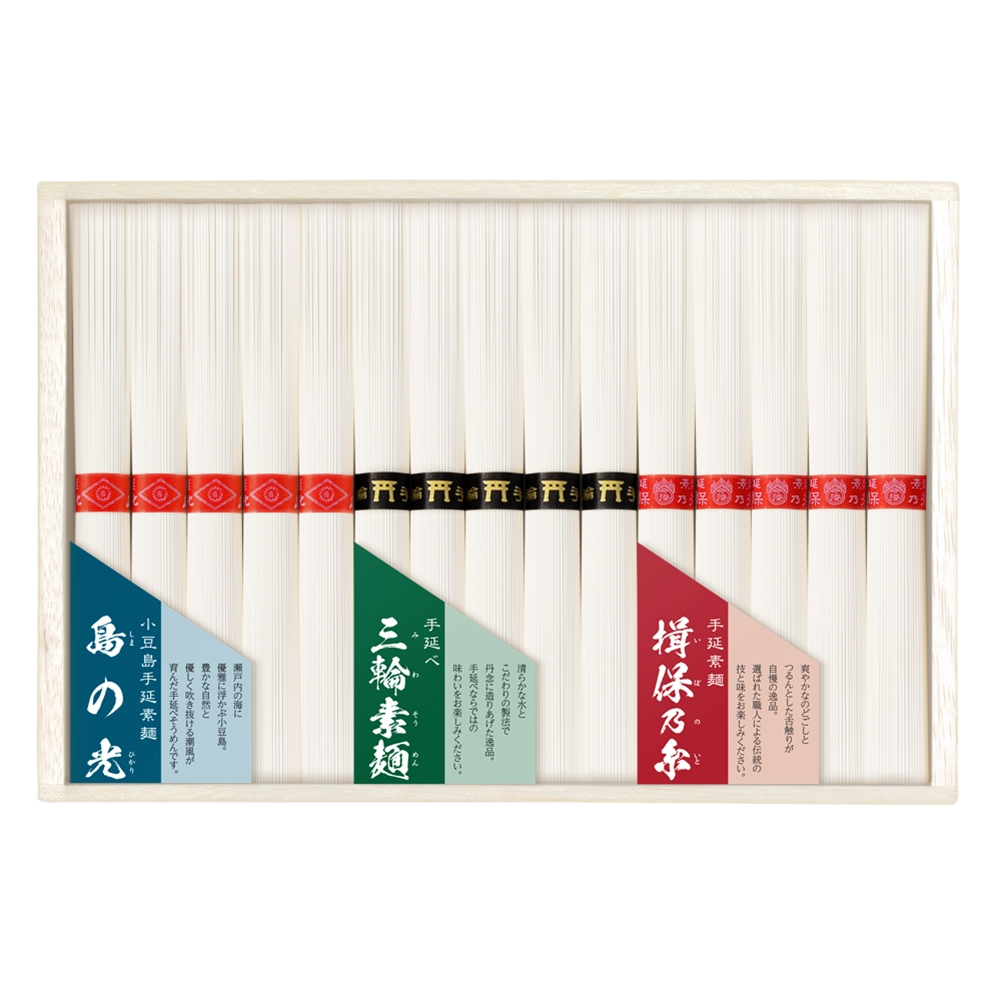 内容:手延素麺「揖保乃糸」50g×10束、手延べ「三輪素麺」50g×10束、小豆島手延素麺「島の光」50g×10束 (木箱入り)