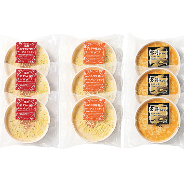 内容:国産紅ずわい蟹とチーズのグラタン・ぷりぷり海老とチーズのグラタン・雲丹グラタン 各200g×3個