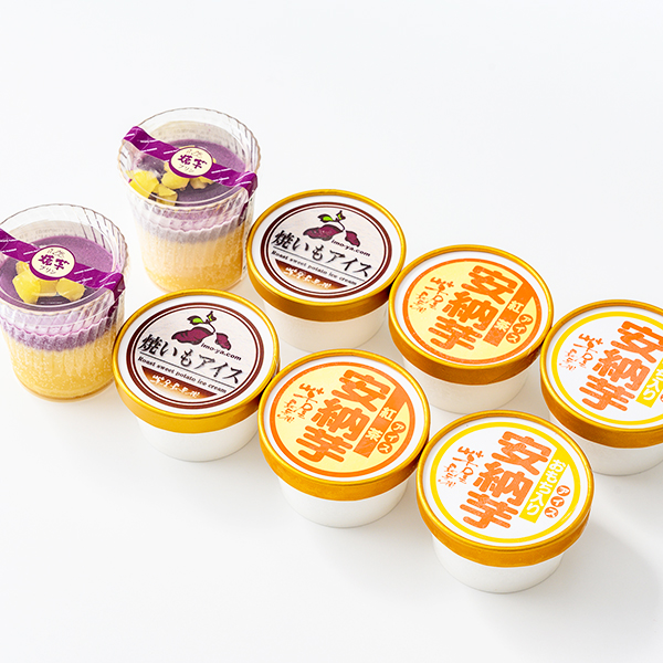 内容:焼芋プリン 120ml・焼いもアイス 75ml・安納芋アイス(おもち) 90ml・安納芋アイス(紅茶) 90ml×各2 計8個