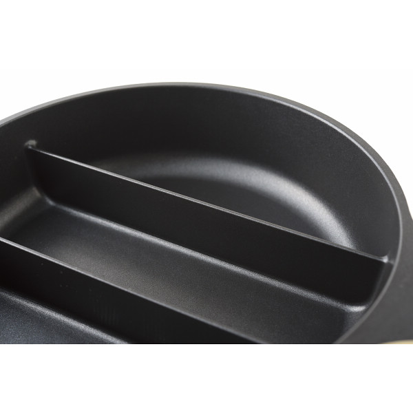 焼き場所が3つあるフライパンで、まん中は卵1個で玉子焼きを作るのに適した幅の5.5cmでお弁当にちょうどいいサイズです。別々の調理をしても洗う手間が1回で済みます。