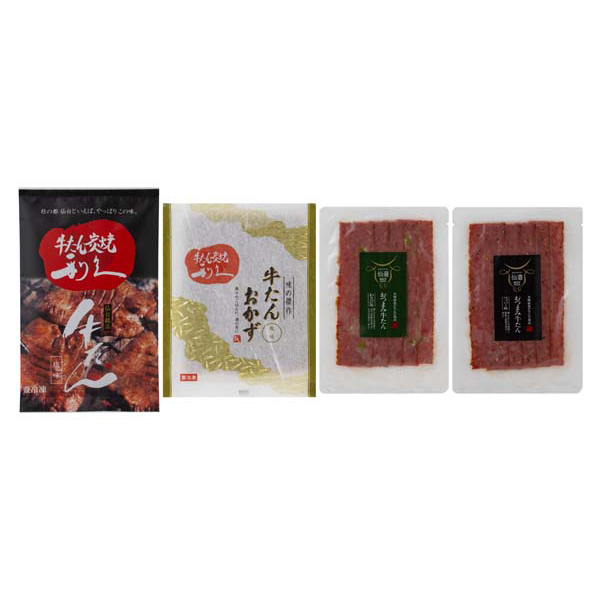 内容:牛たん真空パック(塩味)100g、牛たんおかず塩味120g、おつまみ牛たんわさび味50g、おつまみ牛たんペッパー味50g