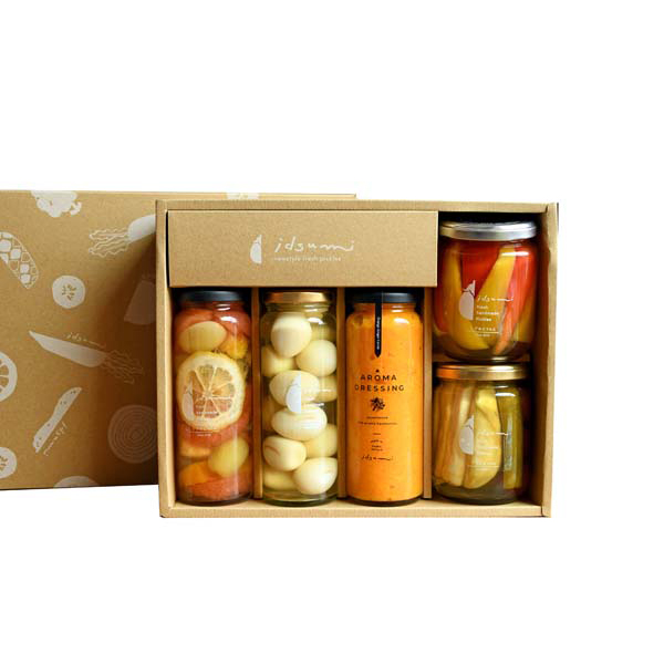 いずみピクルスのカラフルな人気ピクルスの中から特にギフトで喜ばれる物を3品と、コンポート、アロマドレッシングからそれぞれ人気の1品をギフト箱に詰めました。