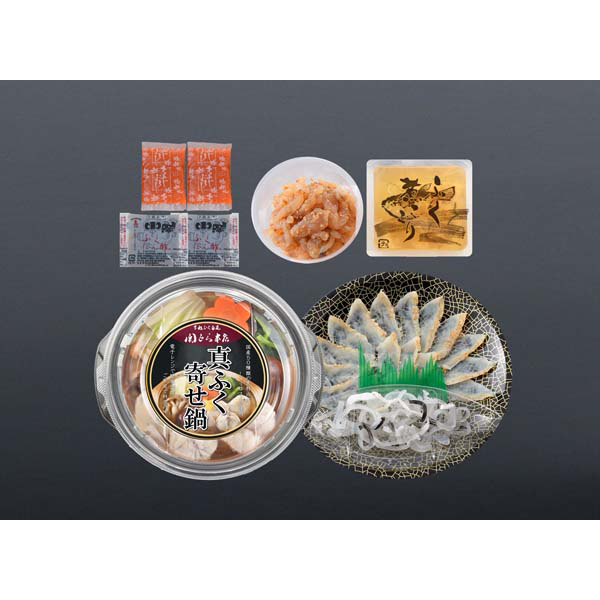 内容:真ふぐ寄せ鍋(個食鍋)300g、真ふぐたたき刺身(17cm皿)20g、とらふぐ皮20g、とらふぐ塩辛60g、ふぐ煮こごり100g、ふくポン酢10g×2、もみじおろし10g×2