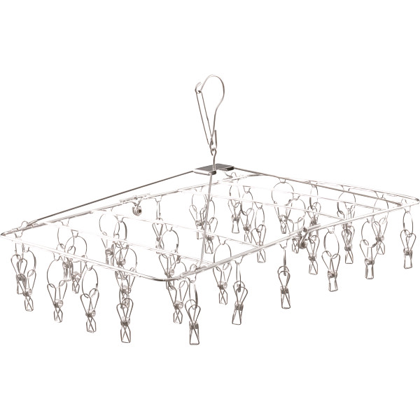 サビに強く、丈夫で清潔なオールステンレス製です。ピンチは絡まりにくく、洗濯物にやさしいピンチ設計です。干すのに便利な回転式ネック、風が吹いても安心なキャッチフックを採用しています。