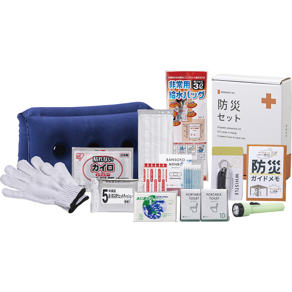 内容:蓄光LEDライト(単3乾電池2本使用・別売)・ウェットティッシュ(5年保存)・使い捨てカイロ・非常用呼子笛(IDカード付き)・絆創膏/綿棒セット(絆創膏×2枚・一般医療機器製造販売届出番号:15B3X10004000001・綿棒×10本)・水に流せるポケットティッシュ・使い捨てマスク・エアークッション・軍手・非常用給水バッグ(3l)・防災ガイドメモ×各1、携帯トイレ(1回分)×2