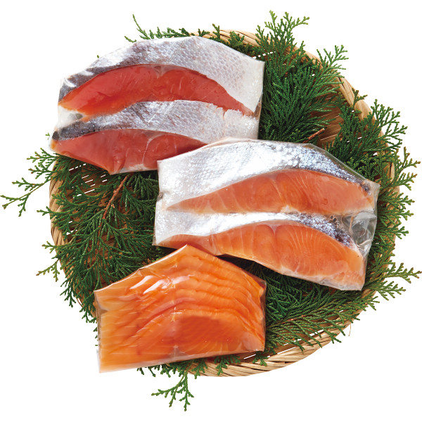 内容:紅鮭(ロシア産又はアメリカ産)・銀鮭(チリ産)(各80g×2切)×各1、トラウトサーモンスモークスライス60g(チリ産又はノルウェー産)