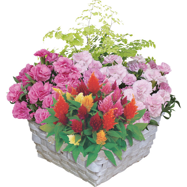 内容:ミニカーネーション「プリティーローズ」3号(ピンク系)×2、アジアンタム3号×1、ケイトウ3号×1、バスケットお手入れのしおり付き