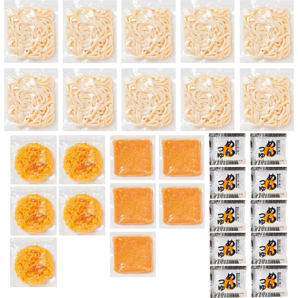 内容:讃岐ゆでうどん150g・うどんつゆ15ml×各10、天ぷら・きつね×各5