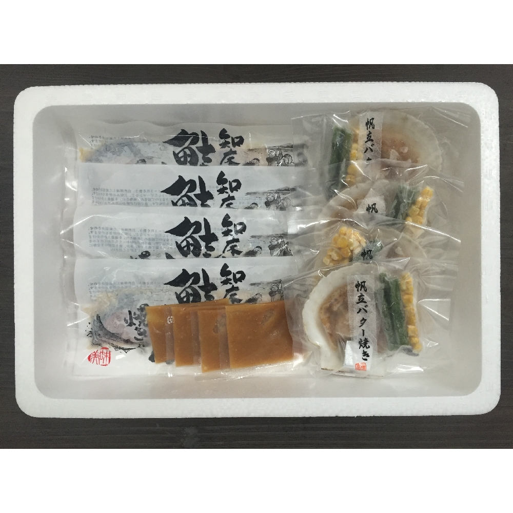 内容:ちゃんちゃん焼き用秋鮭味噌漬切身80g×4枚、添付味噌たれ30g×4袋、帆立バター焼きセット(帆立片貝1枚(北海道産)、アスパラガス10g、コーン10g、バター1個入)×4