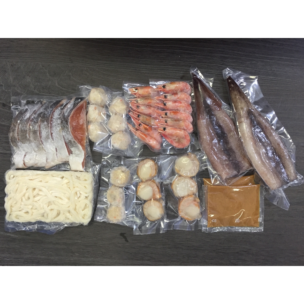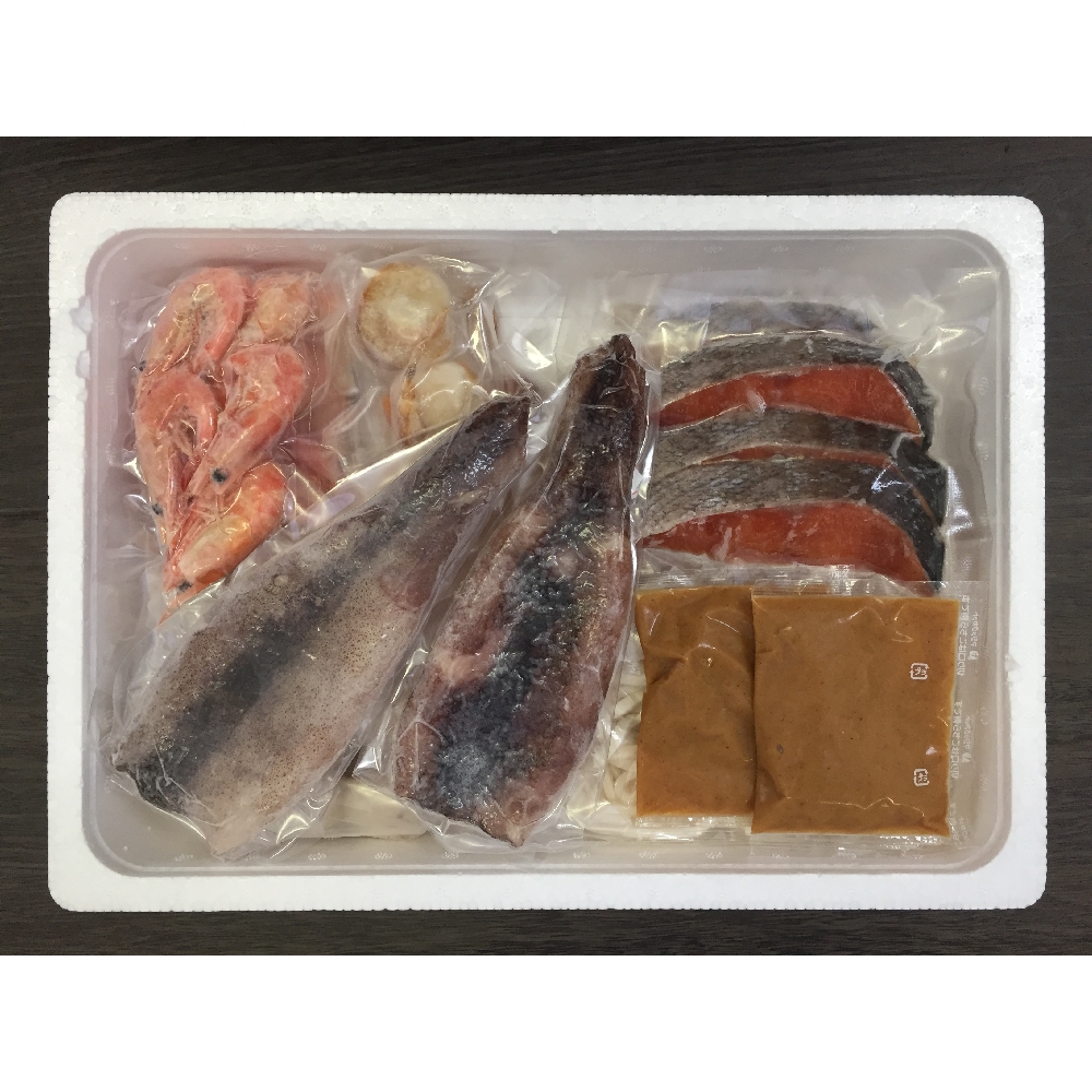 内容:秋鮭切身40g×6切、ボイル海老×12尾、ボイル帆立×6個、かに入つみれ×3個、えび入つみれ×3個、とりごぼうつみれ×3個、ツボ抜きいか×2尾(計200g)、冷凍うどん250g×1玉、たれ(濃縮:味噌仕立て)50g×2袋