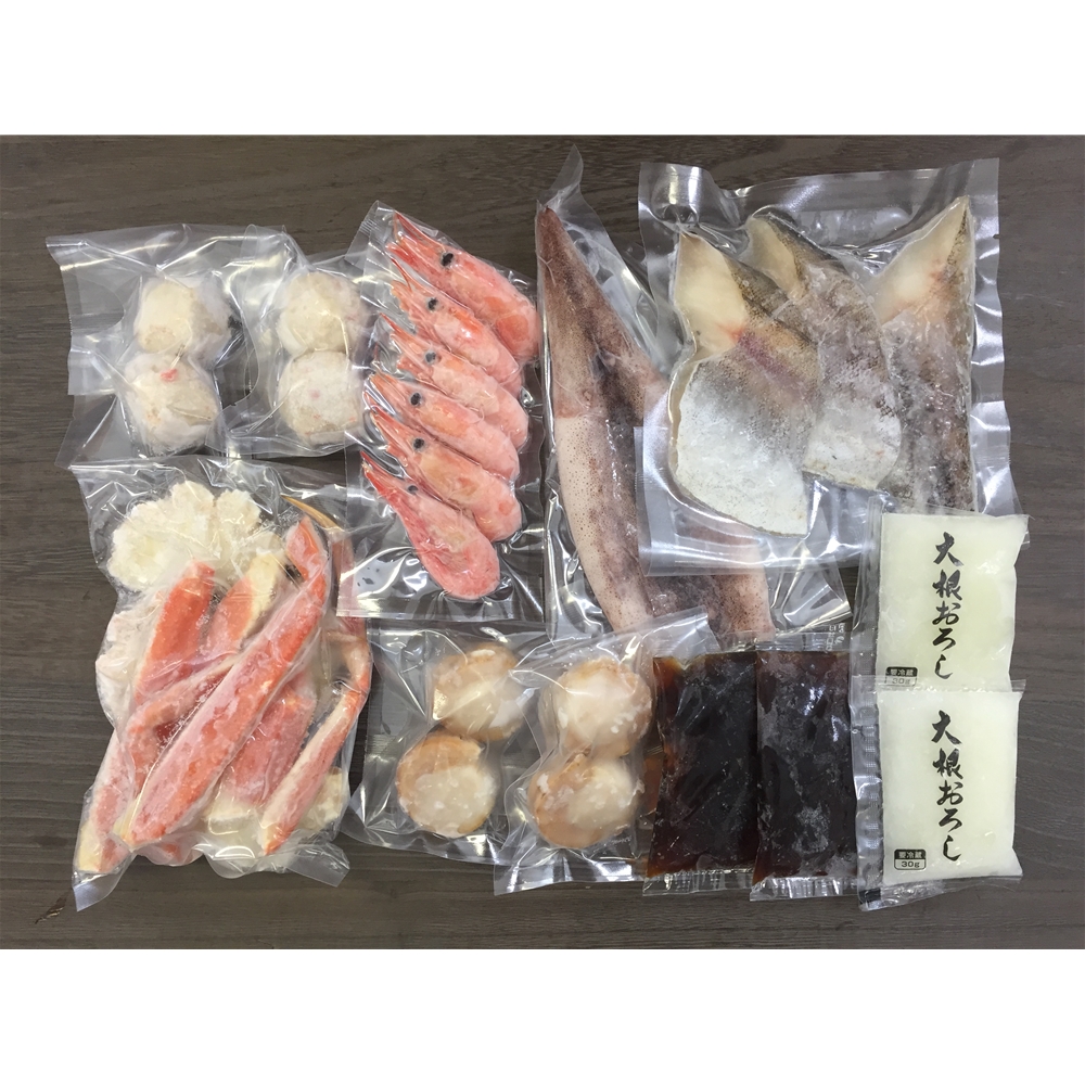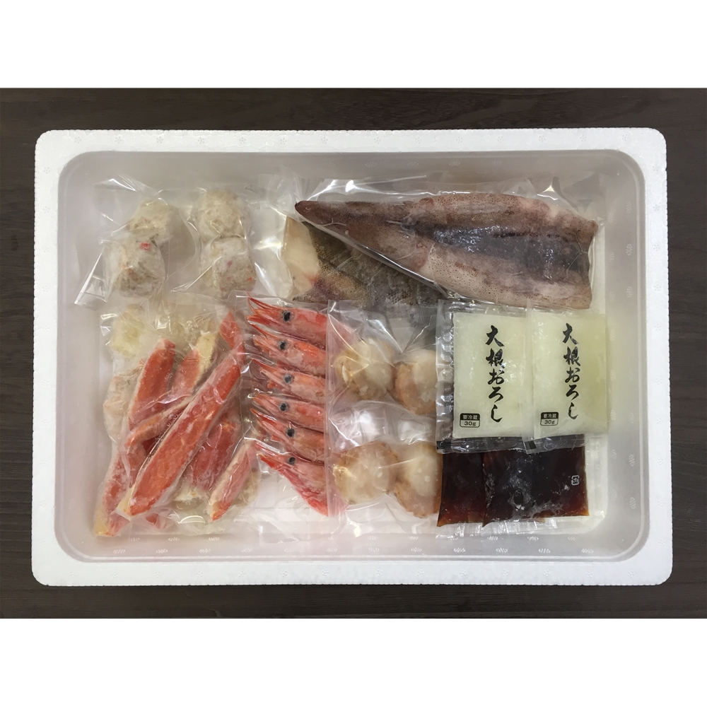 内容:ゆでずわいがにカット200g×1、ボイル海老×6、ボイル帆立×4、かに入つみれ×4、ツボ抜きいか100g×1、助宗鱈切身40g×3、大根おろし30g×2、たれ(濃縮醬油仕立て)50ml×2