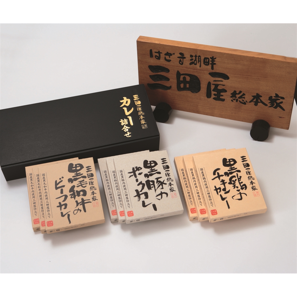 内容:黒毛和牛のビーフカレー、黒鶏肉のチキンカレー、黒豚肉のポークカレー各210g×各3